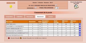 Équipe 2: Victoire par WO face à Tourlaville, qui n’a pas réussi à trouver assez de joueuses pour leur équipe dans ce long week-end. Et cela fait nos affaires puisque du coup, les filles terminent 1ère de leur poule, juste devant Jullouville et cela se joue à la différence de sets !!! Steffie, Myriam, Laurence et Géraldine font donc monter l’équipe en Régionale 1 !