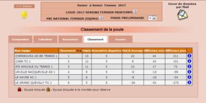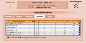 Équipe 2: Victoire par WO face à Tourlaville, qui n’a pas réussi à trouver assez de joueuses pour leur équipe dans ce long week-end. Et cela fait nos affaires puisque du coup, les filles terminent 1ère de leur poule, juste devant Jullouville et cela se joue à la différence de sets !!! Steffie, Myriam, Laurence et Géraldine font donc monter l’équipe en Régionale 1 !